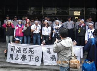 臺(tái)北市議會(huì)國(guó)民黨團(tuán),由國(guó)民黨團(tuán)書記長(zhǎng)秦儷舫領(lǐng)軍,偕同李新、戴錫欽、王正德、林奕華、厲耿桂芳等人,前往臺(tái)北地方法院抗議“二次金改”弊案的不當(dāng)判決?棺h民眾除蛋洗“周X春”人型立牌外,還焚燒前臺(tái)灣地區(qū)領(lǐng)導(dǎo)人陳水扁的照片。