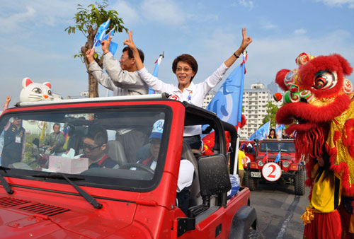 高雄市長選戰(zhàn)12日起跑,國民黨高雄市長候選人黃昭順(右)車隊由競選總部出發(fā),游街造勢。 圖片來源:“中央社”