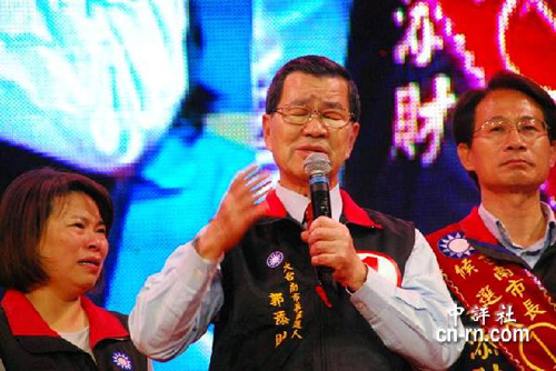國民黨榮譽主席連戰(zhàn)(左)26日晚間出席郝龍斌選前之夜活動,提到兒子連勝文被槍擊,不禁悲從中來。中評社