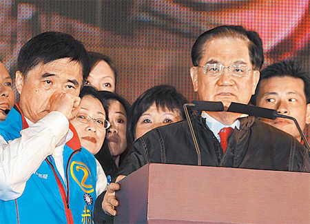 國(guó)民黨臺(tái)北市長(zhǎng)候選人郝龍斌的造勢(shì)晚會(huì)上,傳來(lái)連勝文遭槍擊的訊息后,現(xiàn)場(chǎng)有婦女掉淚,并高喊:“請(qǐng)?zhí)旃酆萌!”郝龍斌帶領(lǐng)民眾為連勝文祈禱。