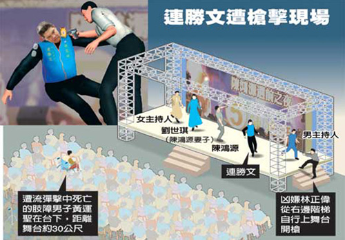 連勝文遭槍擊時(shí),連戰(zhàn)正在板橋市為國(guó)民黨新北市長(zhǎng)候選人朱立倫助選,連戰(zhàn)離開(kāi)會(huì)場(chǎng)后,才在車(chē)上獲知消息,他立刻與妻子連方瑀趕往臺(tái)大醫(yī)院探視愛(ài)子。探視完后,他強(qiáng)忍悲痛,回到現(xiàn)場(chǎng)為國(guó)民黨臺(tái)北市長(zhǎng)候選人郝龍斌站臺(tái),現(xiàn)場(chǎng)逾6萬(wàn)名藍(lán)軍支持者呼喊:“連戰(zhàn)加油!”此刻連戰(zhàn)再也忍不住淚水,哽咽要大家支持郝龍斌 。