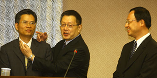臺灣“立法院內(nèi)政委員會”6日邀請內(nèi)政部長江宜樺(右)專題報告“1126槍擊案”,會中“警政署長”王卓鈞(中)說明國民黨榮譽主席連戰(zhàn)的兒子連勝文中槍經(jīng)過。圖片來源:臺灣“中央社”
