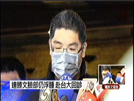 連勝文10日上午要前往臺(tái)大醫(yī)院進(jìn)行復(fù)診、換藥,在赴醫(yī)院前他特別短暫公開(kāi)現(xiàn)身,讓媒體可以看到他臉上的傷勢(shì)及目前身體狀況。連勝文雙眼明顯浮腫,他戴著眼鏡及口罩,右眼邊上貼著透氣膠布。連勝文走起路來(lái)仍顯得蹣跚,媒體發(fā)現(xiàn)他的白頭發(fā)似乎變多了。