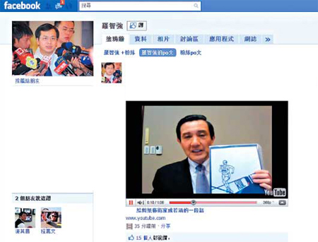 馬英九的facebook明年上線,他19日在羅智強(qiáng)的facebook上放視頻“試水溫”。 來源:臺灣《聯(lián)合報(bào)》