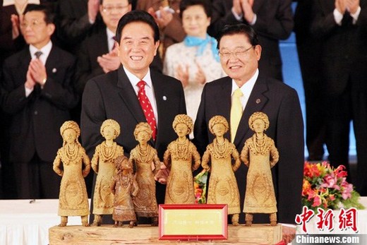 圖為協(xié)議簽署后,江丙坤向陳云林贈(zèng)送的陶土雕塑“齊心傳唱和諧天籟”。該雕塑由著名藝術(shù)家張世蓉以臺東特有陶土雕塑,經(jīng)高溫?zé)贫桑憩F(xiàn)六位身著傳統(tǒng)慶典華服的排灣女子,齊心頌唱著兩岸和平、和諧之天籟美聲。中新社記者 黃少華 攝
