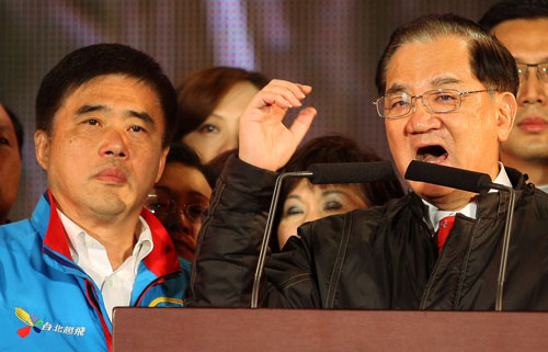 國民黨榮譽主席連戰(zhàn)(右)11月26日晚間出席“我愛臺北我的家─郝龍斌(左)選前之夜”活動,提到兒子連勝文被槍擊,哽咽譴責暴力行為。