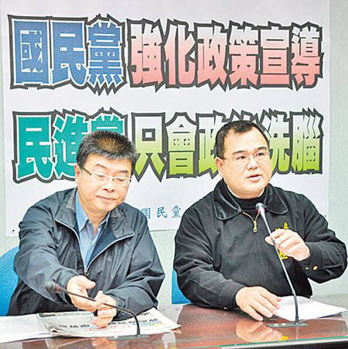 國民黨政策會(huì)執(zhí)行長林益世(右)28日表示,國民黨黨團(tuán)已經(jīng)訂出置入性行銷改革方向、目標(biāo),一定會(huì)堅(jiān)決做下去。 圖片來源:臺(tái)灣《中國時(shí)報(bào)》