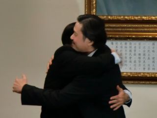 圖為金溥聰和即將接任國民黨秘書長的廖了以熊抱。圖片來源:臺灣“中廣網(wǎng)”