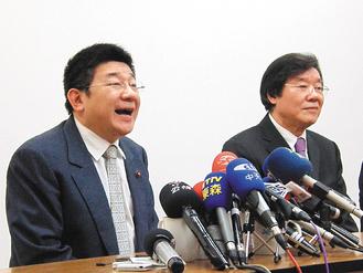 新北市議會(huì)副議長(zhǎng)陳鴻源(左)昨晚開(kāi)記者會(huì),向死者黃運(yùn)圣和受傷的連勝文表達(dá)歉意,他的父親陳明雄(右)眼眶泛紅不發(fā)一語(yǔ)。圖片來(lái)源:臺(tái)灣《聯(lián)合報(bào)》