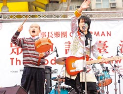 蘇貞昌(左)23日參加董事長樂團(tuán)專輯簽唱會,現(xiàn)場當(dāng)起一日團(tuán)員,拿樂器賣力表演。圖片來源:臺灣《中國時(shí)報(bào)》