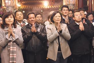 蔡英文(右二)、謝長(zhǎng)廷(右一)和云林縣長(zhǎng)蘇治芬(左一)昨天一起到云林縣北港朝天宮參拜。圖片來(lái)源:臺(tái)灣《聯(lián)合報(bào)》