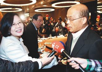 蔡英文離開春酒餐會時跟蘇貞昌握手致意,蘇貞昌還示意“握久一點,讓媒體拍個夠!”
