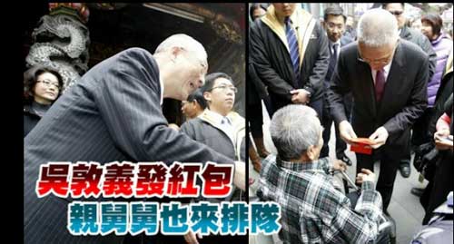 吳敦義昨天抵達(dá)臺中市豐原區(qū)慈濟(jì)宮,上香后發(fā)888個(gè)紅包給民眾,取其吉利諧音“發(fā)發(fā)發(fā)”,吸引大批當(dāng)?shù)孛癖娕抨?duì)領(lǐng)取。82歲的簡百祿雙手握著輔助架,在女兒攙扶下領(lǐng)到一個(gè)紅包,此時(shí)吳敦義突然喊他“舅舅”。報(bào)道指出,原來簡老先生是吳敦義的親母舅,吳敦義隨即又包了近10張的新臺幣千元鈔紅包給舅舅,并說:“這是我的錢,沒有問題啦!”