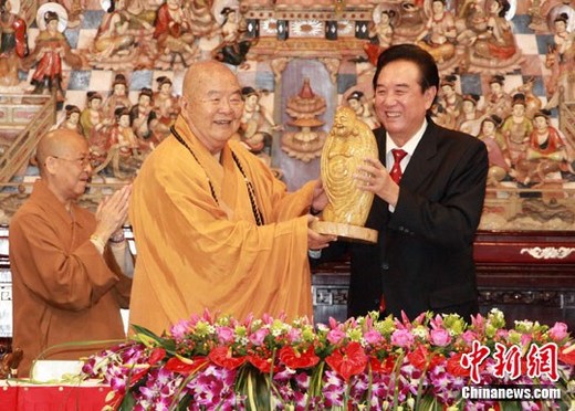 2月24日下午,大陸海協(xié)會會長陳云林一行來到有“南臺佛都”之稱的高雄佛光山參訪,受到星云法師及僧眾的熱烈歡迎。圖為陳云林(右)向星云法師贈送木雕佛像。中新社記者 符永康 攝