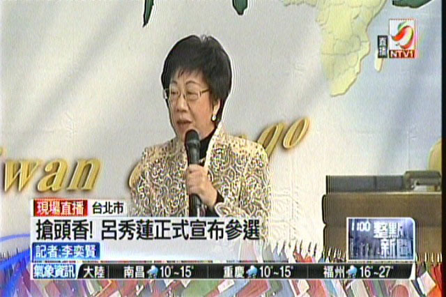 中國(guó)臺(tái)灣網(wǎng)2月28日消息 據(jù)臺(tái)灣媒體報(bào)道,民進(jìn)黨大佬呂秀蓮今(28)日上午在臺(tái)北市大安森林公園舉行造勢(shì)活動(dòng),正式宣布參加2012年臺(tái)灣地區(qū)領(lǐng)導(dǎo)人選舉。
