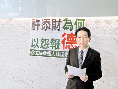 臺(tái)南市長(zhǎng)賴清德輔選大將林俊憲,昨天公開(kāi)用大字報(bào)批評(píng)新科“立委”許添財(cái)“以怨報(bào)德”。