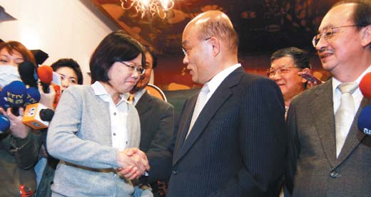 民進(jìn)黨主席蔡英文(左二)搶在蘇貞昌(右二)前宣布參選2012。蘇貞昌因未受邀參與,昨天酸溜溜地說(shuō),“不要因?yàn)橹飨瘏⑦x,而耽誤黨務(wù)工作”。圖片來(lái)源:臺(tái)灣《聯(lián)合報(bào)》