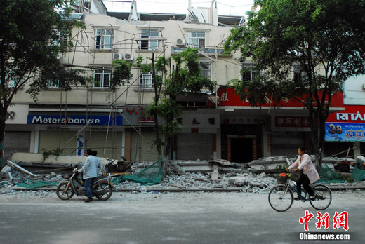 圖為災(zāi)區(qū)民眾清晨從倒塌的房屋前經(jīng)過。中新社發(fā) 任東 攝
