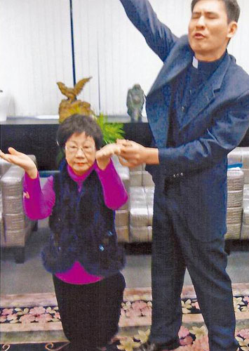 牧師許榮彰(右)日前引領(lǐng)呂秀蓮跪地閉眼,雙手高舉。圖片來(lái)源:臺(tái)灣蘋(píng)果日?qǐng)?bào)。
