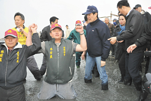 中國臺灣網(wǎng)4月5日消息 據(jù)臺灣《聯(lián)合報》報道,臺灣地區(qū)領(lǐng)導(dǎo)人馬英九與臺當(dāng)局“內(nèi)政部長”江宜樺等人,4日由彰化縣環(huán)保聯(lián)盟成員帶領(lǐng),坐著采蚵車前往大城濕地巡視;海灘前,一群反“國光石化”的民眾舉起“濕地石化無法并存”、“國光石化撤案,濕地才有未來”的布條,甚至有人跪在海灘中,向馬英九宣示保護濕地的決心。