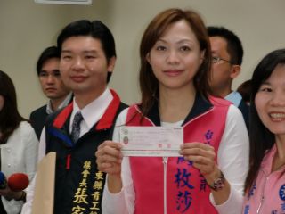 圖為闕枚莎出示馬英九領(lǐng)表繳交的200萬(wàn)元新臺(tái)幣支票。圖片來源:臺(tái)灣“中廣新聞網(wǎng)”。