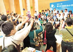 新北市政府29日舉辦大市長與小市長的高峰對談,小市長會(huì)后與大市長朱立倫合影,臺(tái)下小市長的爸爸、媽媽們,則拿著相機(jī)搶著為兒女留下這值得紀(jì)念的一刻。圖片來源:臺(tái)灣《中國時(shí)報(bào)》