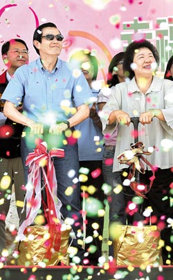 高雄六龜溫泉與農(nóng)特產(chǎn)業(yè)嘉年華系列4日舉行開幕儀式,馬英九(左)與高雄市長陳菊(右)一起加油集氣,釋放夢想氣球?yàn)榛顒?dòng)揭開序幕。圖片來源:臺(tái)灣《中國時(shí)報(bào)》