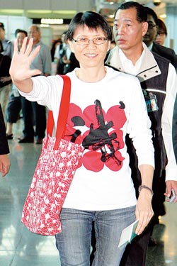 周美青11日下午搭機(jī)啟程赴美,仍是一身輕便打扮。圖片來源:臺灣《中國時報》