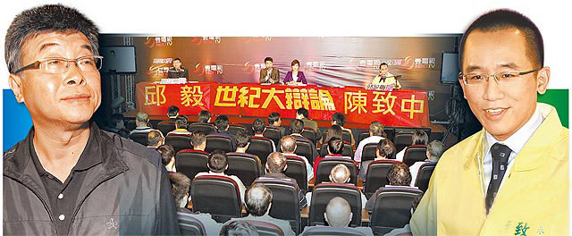 辯論會現(xiàn)場,邱毅、陳致中分坐兩邊,中間是臺灣壹電視主持人。圖片來自臺媒