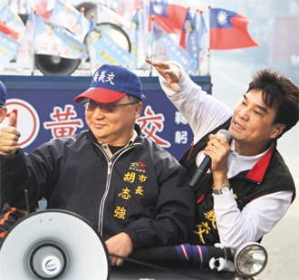 臺(tái)中市長胡志強(qiáng)(左)昨天開始請(qǐng)假輔選,為民代參選人掃街拜票。(圖片來源:臺(tái)灣《聯(lián)合報(bào)》)