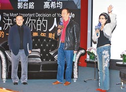 圖為“獻給失落的一代——與青年對話”論壇發(fā)起者鴻海集團總裁郭臺銘(中)、經濟學家高希均(左)、電視節(jié)目主持人陳文茜(右)。(圖片來源:臺灣《旺報》)