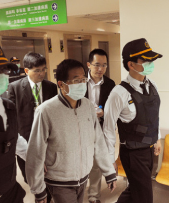 陳水扁(左二)清晨在法警戒護(hù)下,前往桃園醫(yī)院接受健康檢查,陳水扁未戴戒具,由兒子陳致中(右二)陪同步行在醫(yī)院內(nèi)接受包括超音波與斷層掃描等多項(xiàng)檢驗(yàn)。圖片來源:臺灣《聯(lián)合報》