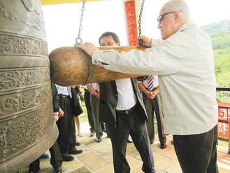 李登輝(右)日前為恒春生態(tài)農(nóng)場(chǎng)的“綿鐘攬?jiān)聵恰苯冶,并登上鐘樓,撞?3次。(圖片來(lái)源:臺(tái)灣《聯(lián)合報(bào)》)