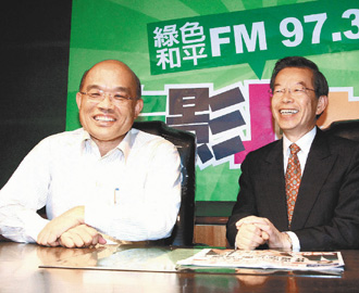 主持電臺(tái)節(jié)目的長(zhǎng)謝長(zhǎng)廷(右),昨天邀參選民進(jìn)黨主席的蘇貞昌(左)接受訪問(wèn),兩人互動(dòng)和樂(lè)。(圖片來(lái)源:臺(tái)灣《聯(lián)合報(bào)》)