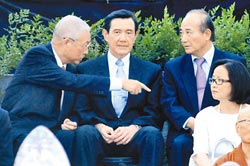 馬英九(右)、吳敦義(左)與王金平(右)13日出席慈濟(jì)浴佛典禮,3人在會中頻頻交談,馬英九表情始終嚴(yán)肅。(圖片來源:臺灣《中國時(shí)報(bào)》)