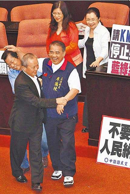 昨午后氣氛轉(zhuǎn)變,下午2時就傳國民黨將在4時發(fā)動進攻,搶回主席臺,綠營“立委”陸續(xù)進場備戰(zhàn)。將近4時,藍營“立委”廖正井、林郁方等進議場,民進黨團總召柯建銘還找兩人聊一陣子,互探虛實。