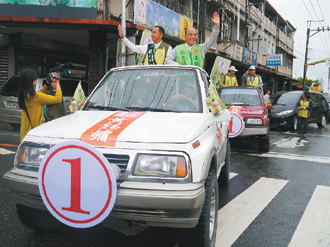 民進(jìn)黨提名的黃錫墉(左)由黨主席蘇貞昌(右)陪同掃街。