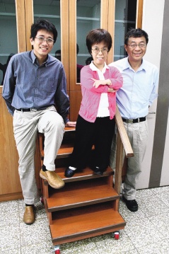 臺灣“中央大學(xué)”網(wǎng)絡(luò)學(xué)習(xí)科技研究所教授陳攸華(中),因身高“迷你”,校方為她特制小樓梯上課,左右兩人分別為力邀她回臺灣的副教授劉晨鐘和教授陳德懷。來源:臺灣《聯(lián)合報》