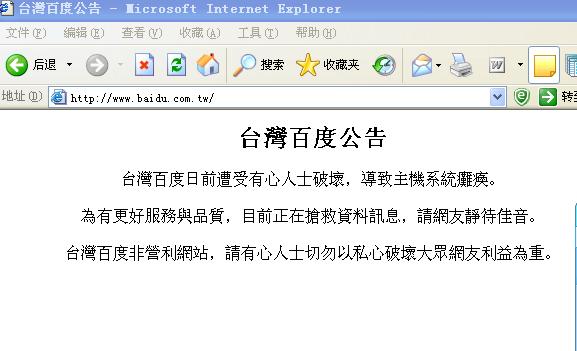 12日,百度被黑長達(dá)6個小時之久,中國大部分地區(qū)的網(wǎng)友都稱在家無法登錄,更有網(wǎng)友將百度被黑之后的圖像上傳到了網(wǎng)上。一波未平一波又起,這次被殃及的不但是百度本身,就連山寨版“百度臺灣”都沒有逃過。13日上午,打開“百度臺灣”(www.baidu.tw)之后網(wǎng)友們發(fā)現(xiàn),頁面上赫然顯示著“谷歌臺灣”的字樣。一時間,網(wǎng)絡(luò)惡搞風(fēng)吹向百度。有網(wǎng)友稱百度被黑引發(fā)了“2010中國互聯(lián)網(wǎng)賀歲劇”。