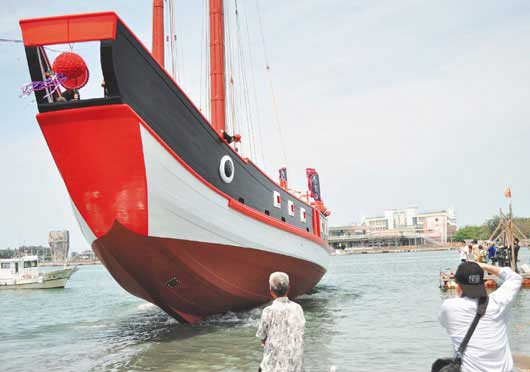 仿鄭成功時(shí)期戰(zhàn)船打造的“臺(tái)灣船”昨天在臺(tái)南市安平港下水,市民搶著拍照,見(jiàn)證歷史一刻。圖片來(lái)源:臺(tái)灣《聯(lián)合報(bào)》