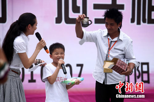 臺(tái)灣“8.8”救災(zāi)英雄賴孟傳(右)和四川汶川“5.12”救災(zāi)英雄林浩(中)互贈(zèng)禮物并合唱《我們都是一家人》祈福兩岸平安。作 者:張浪