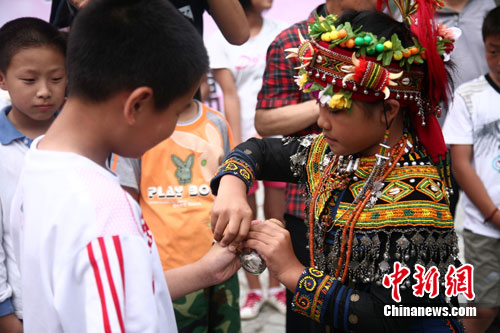 臺(tái)灣排灣族兒童為四川災(zāi)區(qū)兒童帶上平安珠。作 者:張浪