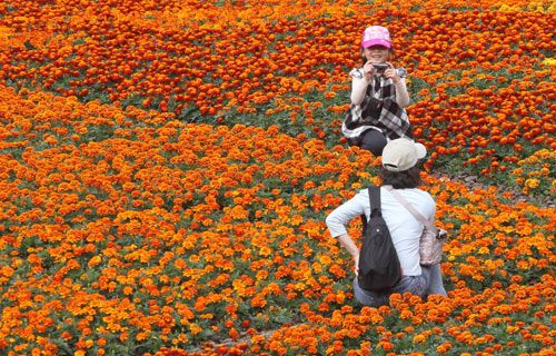 臺氣象部門表示,6日白天全臺多云到晴,傍晚受鋒面影響,北部、東北部云量增多,有零星降雨機會。圖為民眾趁著好天氣,欣賞大片美麗的花海。 圖片來源:“中央社”