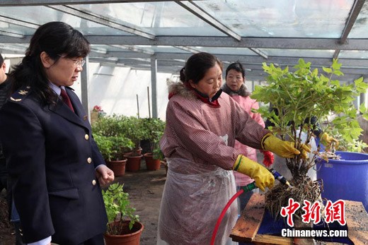 洛陽出入境檢驗檢疫局工作人員正在對參展牡丹生長情況進行觀察。