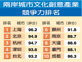 兩岸城市文創(chuàng)競爭力排名。 來源:臺灣《聯(lián)合報(bào)》