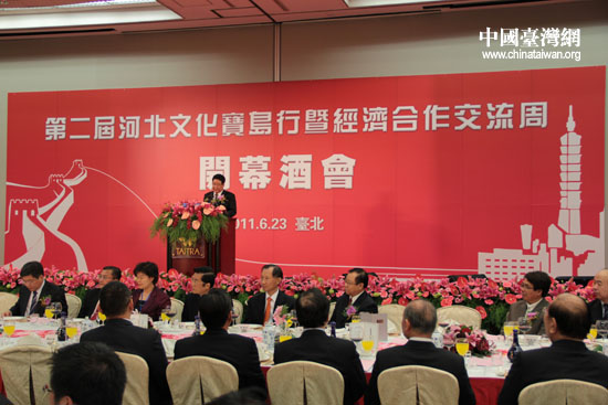 中國(guó)臺(tái)灣網(wǎng)6月23日臺(tái)北消息 第二屆“河北文化寶島行暨經(jīng)濟(jì)合作交流周”活動(dòng)開(kāi)幕酒會(huì)在臺(tái)北世貿(mào)中心舉行,河北省委常委劉永瑞主持開(kāi)幕式。河北代表團(tuán)成員及臺(tái)灣各界知名人士共300余人參加開(kāi)幕式。