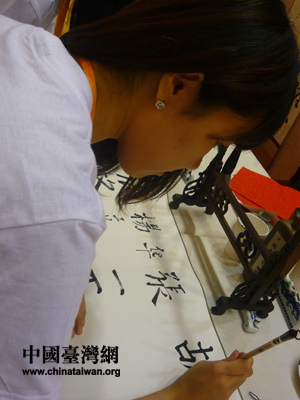 兩岸大學(xué)生在中華優(yōu)秀傳統(tǒng)文化展示和體驗活動中用毛筆書法簽下自己的名字。(中國臺灣網(wǎng) 栗琰 攝)