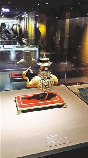 這件“英國十八世紀(jì)銅鍍金仙鶴馱亭式表”由倫敦著名鐘表匠James Cox制造,仙鶴腹中安置音樂機(jī)械裝置,啟動(dòng)時(shí)可演奏四支樂曲。