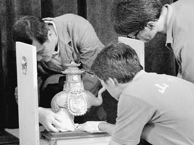 臺北故宮工作人員正在將北京故宮借展文物進行開箱。