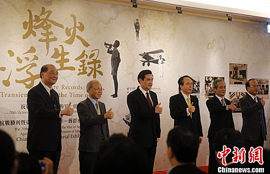 資料圖:抗戰(zhàn)勝利暨臺(tái)灣光復(fù)70周年,兩場(chǎng)紀(jì)念展7月臺(tái)北啟幕。臺(tái)當(dāng)局領(lǐng)導(dǎo)人馬英九(左3)出席開(kāi)幕式。(中新社發(fā) 鄭巧 攝 )
